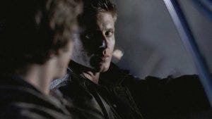 Dean thanks him; without consciously realizing it, Sam gave him the reassurance that Dean needs most, that his brother isn’t going to abandon him. That his brother believes he did the right thing and isn’t judging him for what came before that. Dean took a real chance here, even admitting that he enjoyed decapitating that other vampire, and Sam reinforced his vulnerability and honesty.