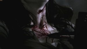 A woman runs through the woods, falling down and then scrambling up, desperate and terrified. She finally hides behind a tree, and of course we’re all rooting for her, thinking a monster is after her. She finally thinks she’s eluded it and looks around the tree – and a large knife slices her head clean off.