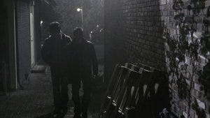 We think Sam and Dean haven’t noticed him, and he follows them down a dark alley. We don’t see Sam and Dean have any conversation, and think they’re in the dark about being followed, but then the guy turns a corner and WHAM, he’s slammed up against the wall and Dean Winchester has a knife to his throat.