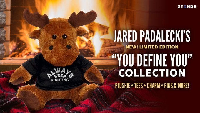 Jared started a new AKF campaign with Stands that included a plaid AKF charm and a stuffed AKF moose, which is seriously adorable. He did a facebook live about the campaign, which he hasn’t done in one million years and posted a gorgeous photo in the You Define You hoodie and with his new Walker haircut. Mmm.
