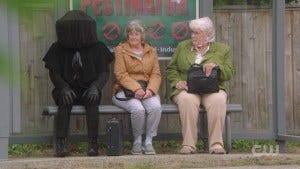 Box-on-head guy in black returns to the bus stop, and once again Sam and Charlie do nothing.