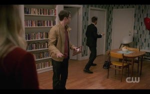 The other story line plays out with Harper opening the library door to let zombie dude in, which I didn’t see coming until a little while before that point. Dean and Jack get much longer to wrap up their case, with a nice scene of zombie dude chasing Jack through the library while Harper waxes poetic about love (and makes a confession in the process) on the PA system. Seems she’s been the mastermind all along, a necromancer who killed her boyfriend to keep him with her and then brought him back so he can kill her other suitors and eat them. Lovely. Dean hatches another plot to try to make Harper fall in love with Jack so that zombie boyfriend will turn on her. It doesn’t entirely work, but Dean gets zombie dude restrained in silver handcuffs anyway. Harper escapes.