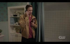 I laughed out loud again. Alex Calvert has a real flair for comedy, as does Speight for directing it. Their phone call gets interrupted when Dean gets attacked, and Jack reappears from the bathroom. More awkwardness ensues, then Dean comes bursting in the door followed by a Riverdale-esque zombie (also Harper’s ex boyfriend).