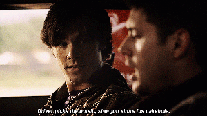 Dean: House rules, Sammy. Driver picks the music, shotgun shuts his cakehole.