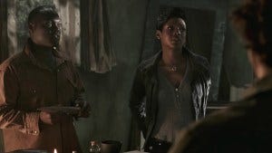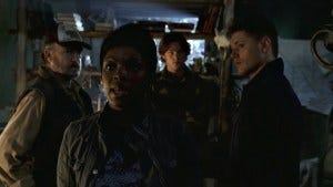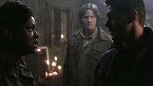 Sam and Dean exchange a look, Sam upset and Dean defensive. And protective. He and Isaac look ready to square off, Isaac insisting they brought war down on “all of us”. Tamara pulls him away, as Sam calms Dean down too, telling Dean quietly that this isn’t helping.
