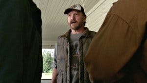 Dean opens the door, goes out, very very slowly…. Annnnnd a man gets the drop on him anyway, holding a gun on him as he lies on the ground.