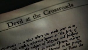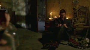 Sam’s sitting in the Impala at night, reading about Dr. Faustus and his deal with the devil at the crossroads by flashlight – while Dean is inside a motel or house or something.