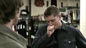 To Sam’s “working…” explanation, Dean fakes a dramatic cough.