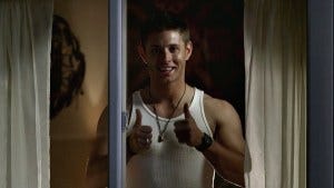 Dean, in an undershirt, flashes Sam a big horny grin and gives his brother a thumbs up, Sam smiling indulgently.