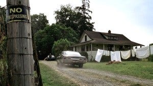 The next morning they get to a farm outside Lincoln Nebraska. Dean gets out of the Impala chowing down on a big burger – early Season 3 was not subtle about the fact that Dean needed to be either fighting, fucking or feeding his face so he wouldn’t have to think about the hell hounds coming for him or how guilty his brother feels about the deal he made.