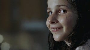 But when the mom gets home to her dark house, there’s the sound of water dripping – from the chair that creepy kid is sitting on, soaking wet!