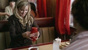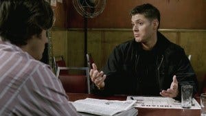 Sam’s in a diner, chatting with Bobby on the phone about a demon dispelling ritual he found, and sounding more than a little desperate trying to find a way to save his brother. Dean walks by the window and waves a newspaper at Sam, as Sam hurriedly hangs up.