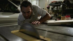 Suddenly as the guy goes to leave, the table saw starts up all on its own. The man turns back and goes over to investigate, leaning in and getting his face up close and personal.