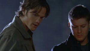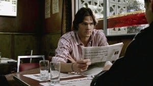 Let’s pause for a second and just appreciate Sam and Dean circa 2007, with their beautiful baby faces and the way they still smile and joke around so much, even with Dean’s deal hanging over their heads. Let’s also appreciate that this was 2007 and they got their cases from the newspaper. One of the things I love the most about Supernatural is that it always seems timeless. Even when I was watching it in real time, it always had a sense of being in the past anyway, with its past-their-heydey motels and little Americana towns. So Sam and Dean reading a newspaper? Fits right in, even now.