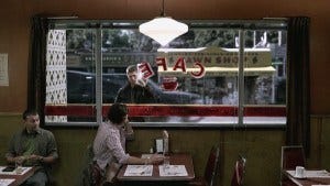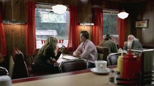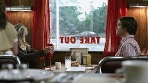 Ruby sits down across from him at the diner and helps herself to some of his fries.