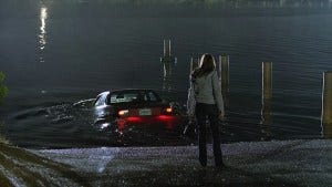 Tears running down her face, she gets out and inexplicably the girl does not, just sits there looking back at her as it goes under. Bubbles come up in the dark lake.