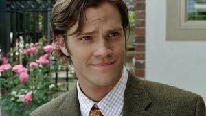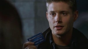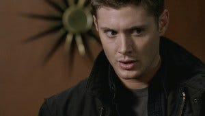 This scene would make so much more sense if Dean was dressed the way Jensen Ackles dresses now, instead of in kinda baggy jeans and a longer jacket that don’t show off his assets very well. Alas. Dean realizes he’s being ogled as the women stare at his (admittedly very fine even in baggy jeans) ass.