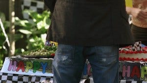 Dean joins Ben and the two stand side by side and ogle a mother and her eight year old daughter walk by as they eat cake.