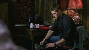 Back at the motel, Sam’s been researching. I’m struck that this is how Sam and Dean looked as I had just fallen hard for this show and these characters, Sam always wearing that little jelly bracelet, bangs in his face.