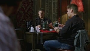 (This screencap amuses me because some of my favorite things that I have from the Supernatural set are that sugar container and the matching salt and pepper shakers that are in this diner scene and many many others – they are now our everyday condiment containers!)