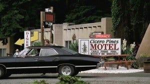 The kitschy in room fake flower box, the velvety bedspreads, weird mirrored panels and red flocked wallpaper – it all contributes to Supernatural’s timeless feel and I love it so much!