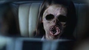 Cut to poor Katie’s mom, who in true horror show fashion, straps her daughter into the back seat of the car, glancing at her in the rear view to see her truly monstrous face, and then, sobbing, drives the car right into a lake with Katie in it.