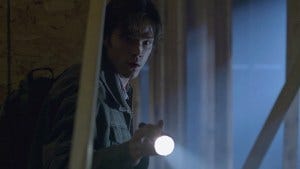 The boys investigate, only flashlights to light up the dark. There are creaks and scuffles and little noises and the boys keep getting startled, spinning around to shine a beam of flashlight.