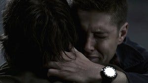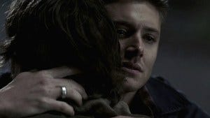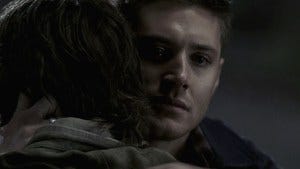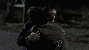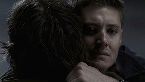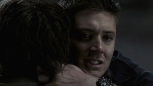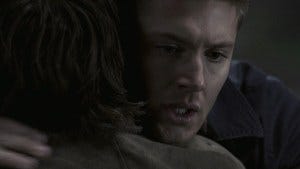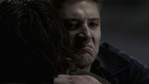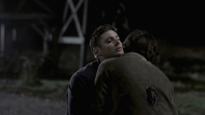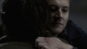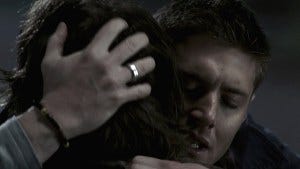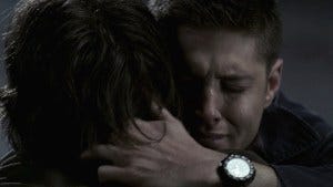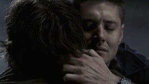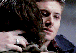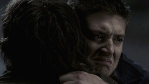 Dean holds Sam, anguished, hand clutching at Sam’s hair to hold him there. He turns his face into his little brother and cries.