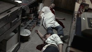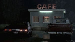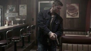 Dean leaps out of the car and runs inside, the sense of urgency immediate. He finds a customer dead at his table, head down in a pool of blood. Dead guys behind the counter.
