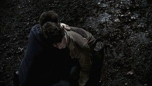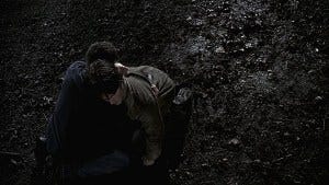Dean buries his face in Sam’s shoulder, clutching the back of his jacket as they kneel together in the mud.