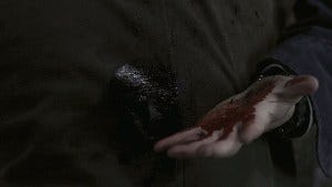 Dean’s instincts kick in, his sense that something is terribly wrong. He reaches around to Sam’s back and feels how much blood is there, looks at his hand coated in his brother’s blood. Ackles is so damn good, you can see every thought in Dean’s head as he processes just how much there is, what that has to mean.