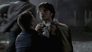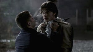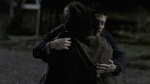 Sam staggers toward Dean, who’s heading towards him, when Jake gets up behind Sam and picks up the knife that Sam left behind.