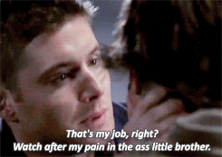 Dean: Sammy, Sam, hey, listen to me, we’re gonna patch you up, okay? You’ll be good as new. Huh? Huh? I’m gonna take care of you, I’m gonna take care of you, I’ve got you. That’s my job, right? Watch out for my pain in the ass little brother?