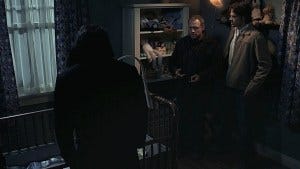 Sometimes I forget just how scary Supernatural was! Just in time, Sam bursts in and hits her with an iron poker – she smokes out of the building.