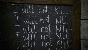 The scene is filmed desaturated, almost black and white, and the chalk board creaks as the girl starts to write on it. She looks scarier and scarier, an ominous giggle as she writes “I will not kill” on the chalk board and then advances on Jake with nails that have turned into lethal claws.