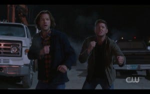 Sam and Dean are woefully outmatched, ineffectually punching with no effect. Dean gets kicked in the nuts and choked (and tries to tap out, which actually works!) Ackles made that moment funny, and my guess is that was an adlib. At least Jared and Jensen were clearly enjoying being able to make fun of themselves in this episode. I’m enjoying the gifs ans screencaps outside of the context of what was actually happening.