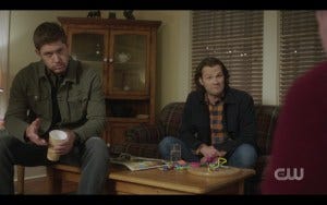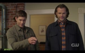 I really enjoyed the first part of the episode; I went into this one just looking to be entertained. Most of us knew the premise was something about Sam and Dean having “normal people problems”, which sounds pretty innocuous and has the potential to be funny. After all, Jared and Jensen are gifted at comedy, so maybe this would be a chance for them to exercise those comic chops as well as a chance for me not to gnash my teeth. And for a while, that worked. My first tweet of the night was “OMG I’m loving this episode!” Jared and Jensen were clearly having a good time with it, and just that is enough to make me happy too. They have always loved the humorous moments, and they play off each other seamlessly.