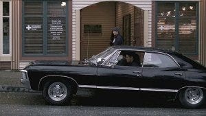 They eventually give up the brotherly bickering and continue to Oregon, driving past the sign that Sam saw as they pull into a small town.