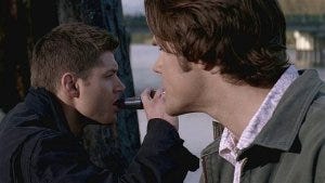 The last scene of this episode is one of the most iconic of the whole series. Dean and Sam park the Impala near a river, leaning against a distinctive fence drinking beers. Sam wants answers, and knows that Dean has been evasive. Dean, for his part, is being eaten up by the secret he’s keeping – what John told him. And so are we, the audience who’s watching live!
