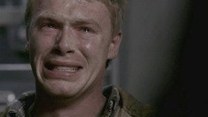 Sam, still lying on the floor, reaches up for Dean, as he must have reached for his brother’s hand a million times, and Dean reaches down to help him up – but Mark pulls him back, warning that Pam bled on him, and that Sam has the virus now.