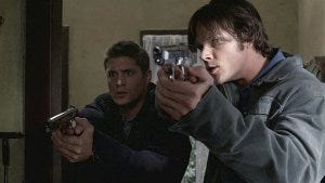 The Winchesters kick in the back door, shooting the dad, but the son jumps out the window and runs away. Sam aims his gun at him, but doesn’t shoot.