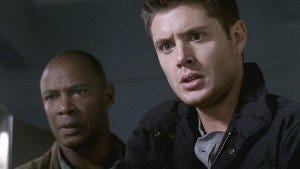 We see the events of Sam’s premonition start to play out, Duane begging and swearing “it’s not in me” and Dean muttering, “I got no choice.” He’s struggling though, Sam’s words ringing in his ears.