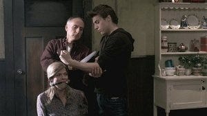 As Mark and Duane drive away, Duane asks to pull over, saying he’s gotta make a call. When Mark points out there’s no phone out there, Duane says he has it covered, pulling out a knife and slashing Mark’s throat. It pours into a bowl and he swirls it around until he reaches someone on the other end.