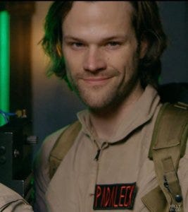 There are priceless little moments – a J2 fist bump after a scene, their shared joking around, even Jared unable to resist exploring the back of Jensen’s proton pack as he stands behind him waiting for the busting in of the door.]