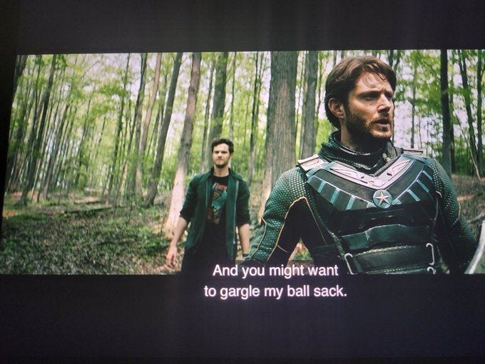 The Legend laments that he actually produced that “piece of shit” as Hughie interrupts to say that Soldier Boy asked him to tell The Legend he’s out of Astro Glide. I took a moment to go HUH and OH when that line happened, wondering where we were going next. Hughie also takes issue with The Legend’s contention that you don’t make friends with ‘the talent’ because they’re all the same, still wanting to believe that “Soldier Boy was a hero, right? He stormed Normandy?”