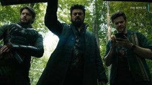 They make their way through the woods, Soldier Boy increasingly paranoid and asking Butcher and Hughie what they said when they were silent.