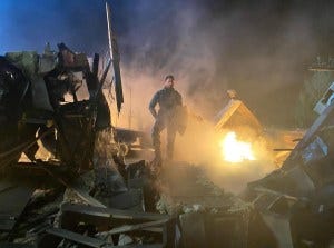 Butcher carries an unconscious MM out of the destroyed house, and Soldier Boy emerges out of the smoke.