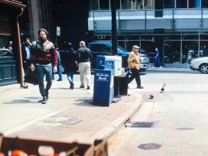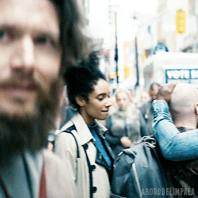 He’s overwhelmed by the ringing cell phones and posters of Robert Singer and Dawn of The Seven on the side of a bus and two guys kissing on the street. It’s a short scene, but it’s clear how out of place and time he feels. We get a little glimpse of his homophobia too in his raised eyebrows at the two men being openly affectionate.
