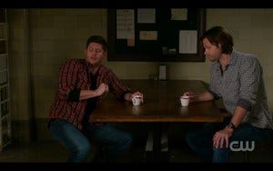 5. And that brings me to Sam and Dean. Here’s where there were some things I liked and some I most definitely didn’t. I liked Sam and Dean being a united front repeatedly – during this episode and during this season. We get a little glimpse of Winchester domesticity (one of my favorite things in the world) as they come home with their bags of groceries. When they find Mick there they confront him about breaking into “our home”, and I get a little happy shiver, because it IS. They sit on the table side by side, shoulders touching, a literal united front.