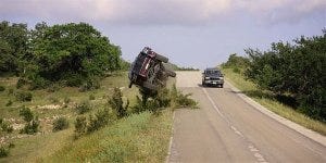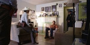 A shocked and enraged Walker is driving back to the ranch in his pickup truck when another pickup truck runs him off the road. The truck flips over, and director Speight films it from the inside, from Cordell’s perspective, which was terrifyingly effective.